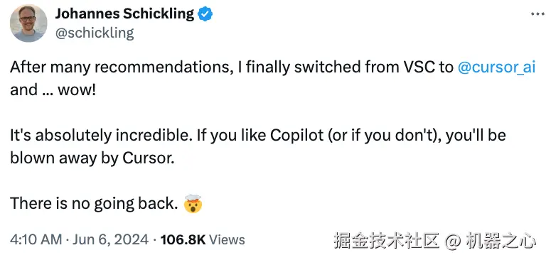「如果你喜欢 Copilot ,那准备迎接被 Cursor 惊掉下巴吧!体验过 Cursor,你就再也回不去了。」