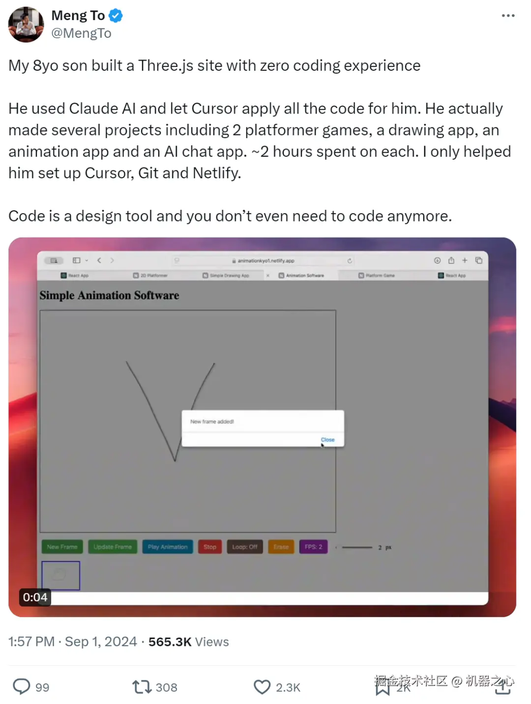 「我 8 岁的儿子在没有任何编码经验的情况下建立了一个 Three.js 网站,他利用 Claude AI 工具,并让 Cursor 为他完成所有代码工作。实际上,他完成了好几个项目,包括两个平台游戏、一个绘图应用、一个动画应用和一个 AI 聊天应用,每个项目大约花费 2 小时。我仅帮助他设置了 Cursor、Git 和 Netlify。」