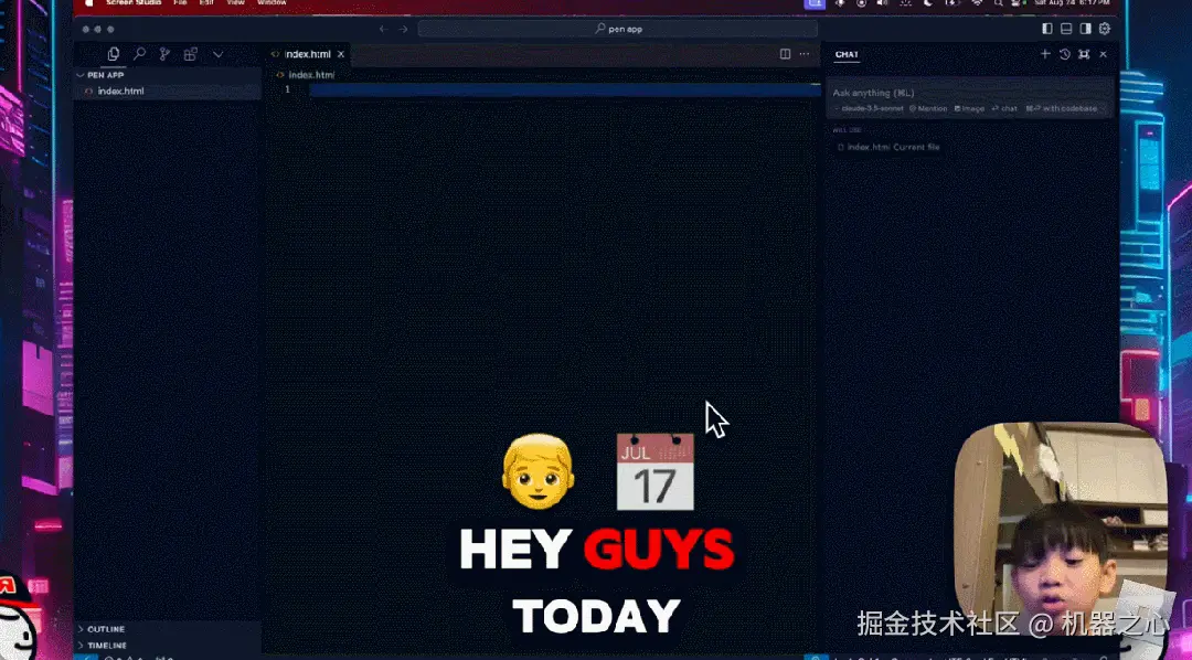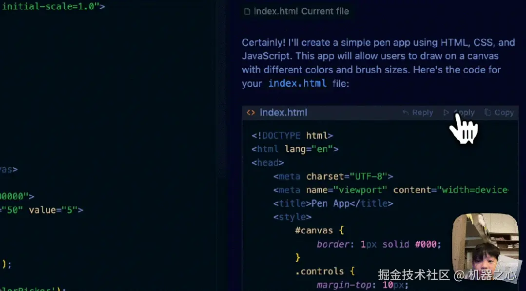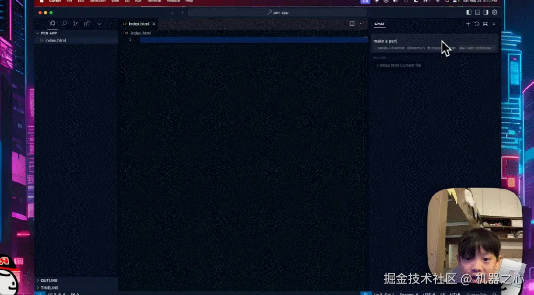 接着,小孩熟练的在右边栏键入「make a pen app」,Cursor 会帮助生成相应的代码: