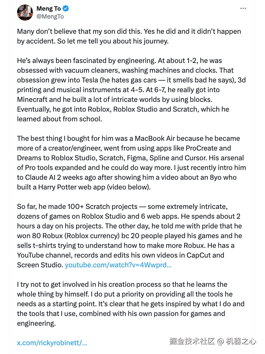 这位孩子的父亲名叫 Meng To,是在线学习提供商 DesignCode 的创建者。刚刚,他在 X 上分享了这个令人惊讶的消息: