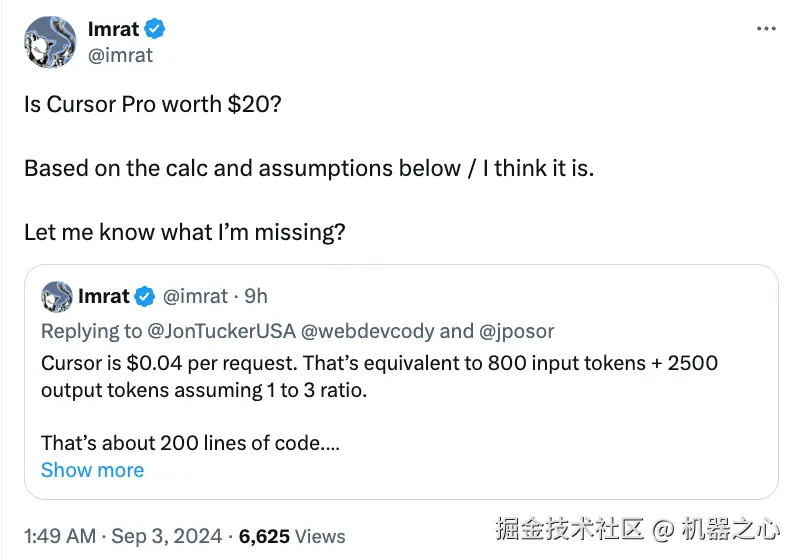 有网友还算了一笔账,每月花 20 美元使用 Cursor 值不值?他的结论是:Cursor 的每次运行成本大约为 0.04 美元,包括约 833 个输入 token 和 2500 个输出 token,根据输入输出比率 1:3 计算,性价比可谓非常高。