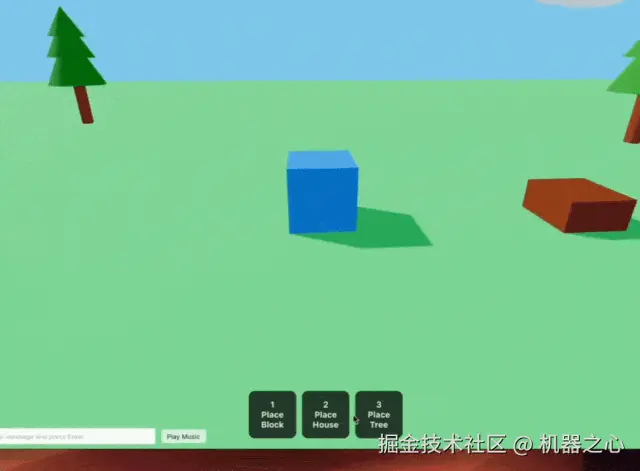 首先看到的是一个方块游戏,蓝色方块移动到哪,点击底部的按钮,就会出现按钮中文字对应的物体: