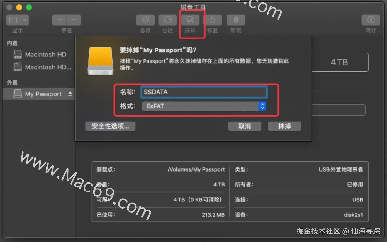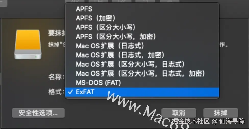 3、点击抹掉按钮,在弹出的对话框中输入名称(任意),格式选择 ExFAT