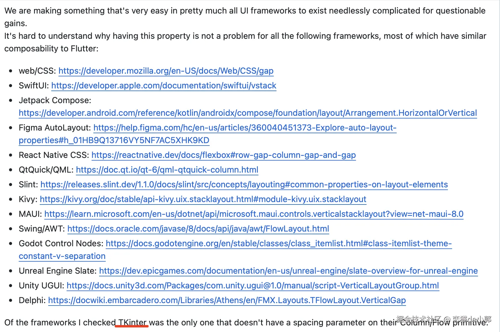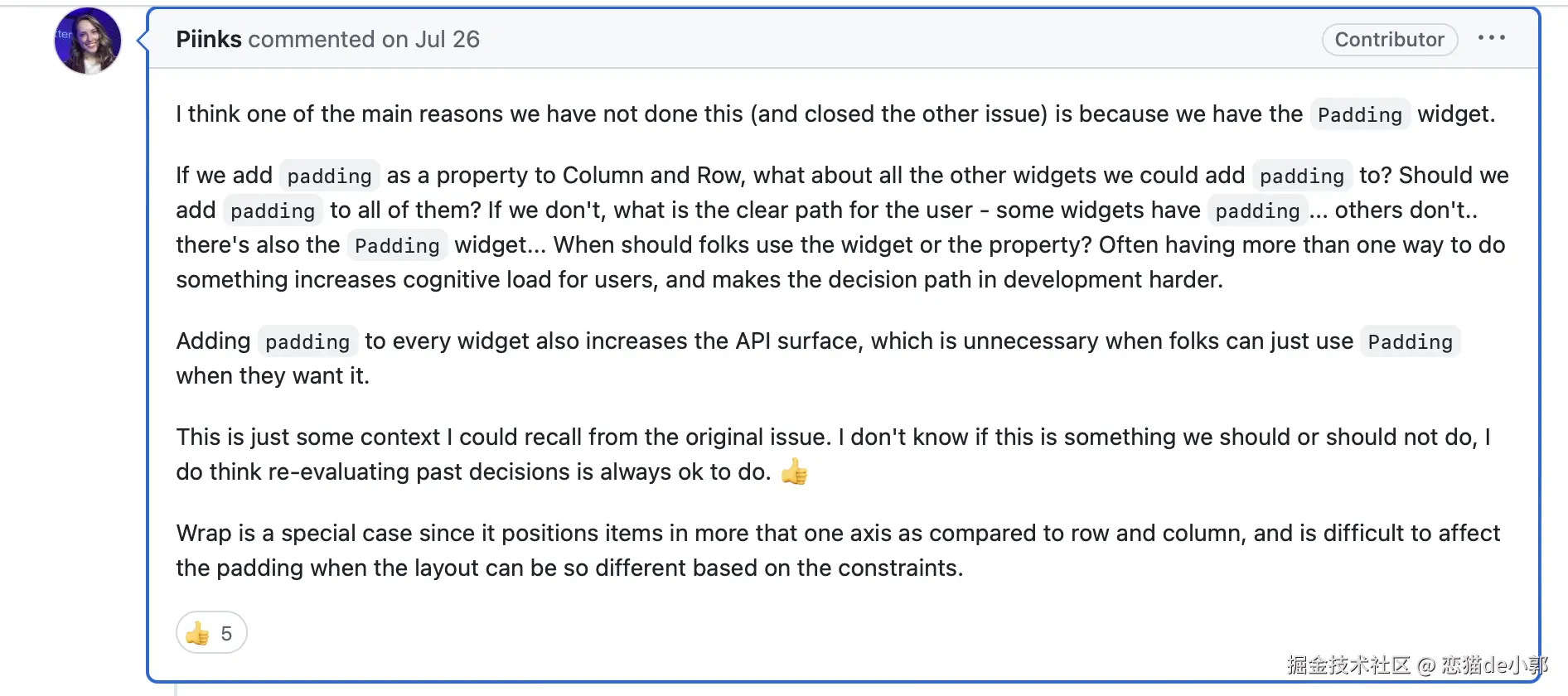 而后在 2020 年,Flutter 在 #55378 用户希望再一次推进 Row/Column 内置 spacing 的实现,但后续从 PM 的角度却认为,这并不是一个很急需的功能,并且正常情况下通过额外的实现也可以做到类似需求,而通过增加 Flex 的复杂度来内置这种“非必需”的 spacing 完全没必要。