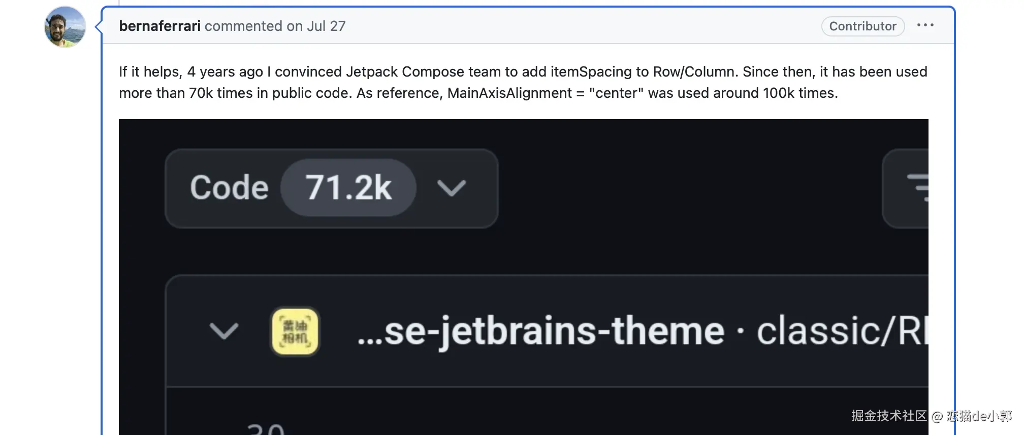 事实上 Colum 和 Row 一开始缺乏 spacing 相关配置并非 Flutter 特例,早期 Jetpack Compose 同样缺少 itemSpacing ,只是四年前 Jetpack Compose 通过了用户的提议,后续才有了 Arrangement.spacedBy 的相关支持,而这也成为了 Flutter 在 Row/Column 同样需要内置 spacing 的有力佐证。