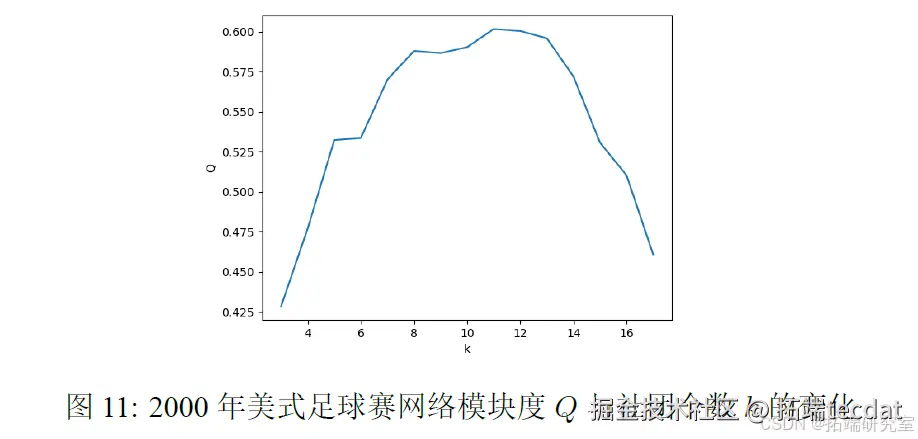 选定高斯函数中的参数σ = 5,k 近邻算法中参数k = 5,利用3.2 节所介绍的算法对该网络进行处理。模块度Q 与社团个数k 的变化情况如图11所示。模块度Q 最大值为0.602,对应的社团个数为11。与实际的12 个联盟有误差,但两者模块度相差不大。