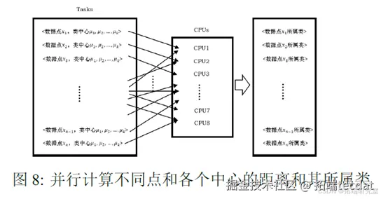 k-means 聚类是一个迭代过程。每次迭代分为两步:首先,找到每个点离它最近的中心点并归入该类;其次,重新计算中心点。重复上述两部,直到收敛。本文采用的收敛准则是前后两次聚类结果一致。由于新的中心点会被用于下一步迭代,且在每次迭代中必须更新,因此迭代过程无法并行。但是,计算不同点和各个中心的距离和其所属类是可以并行的。