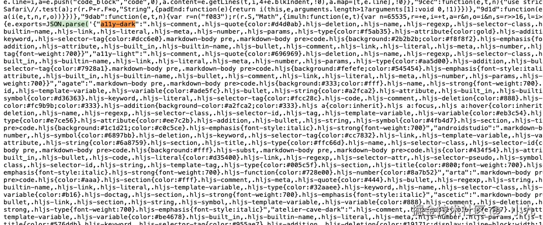 可以看到网络请求包含了主题的所有样式,其实这也是juejin-markdown-themes库导出的默认文件,被打包进来了,于是我选择在网络请求上继续查找,但是发现虽然有主题的样式,没有高亮主题的样式,想着掘金是服务端渲染,并且在点击切换高亮主题的时候并没有发起新的网络请求,说明其样式被打包到了js文件当中,所以只需要搜索一个主题名称,在不同js文件搜索即可, 比如搜索第一个主题a11y-dark,但是我们需要先找到其加载的js文件,点击显示网页源代码即可。 在搜索一番之后在lf-web-assets.juejin.cn/obj/juejin-…这个文件之中搜索到了。
