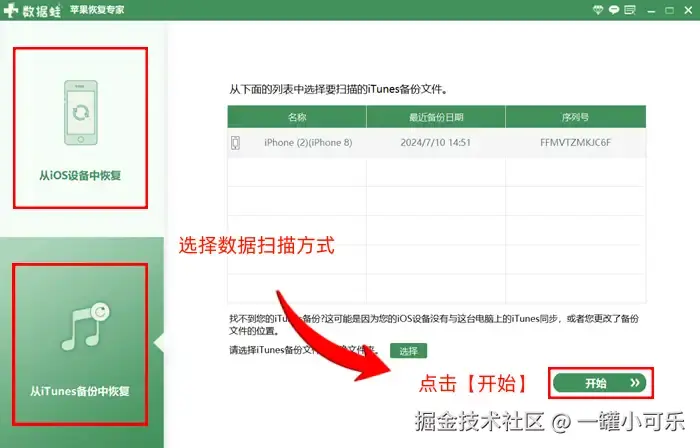 步骤1:打开工具运行,使用数据线连接电脑和手机后,点击相应的数据扫描方式,然后再点击 【开始扫描】 。