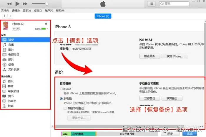 步骤2:根据其显示的选项,选择 【摘要】 项,然后在手动备份的选项中点击 【恢复备份】 按钮即可。