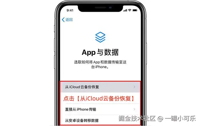 步骤2:根据手机屏幕的提示,点击 【从iCloud云备份恢复】 ,选择恢复通话记录即可。