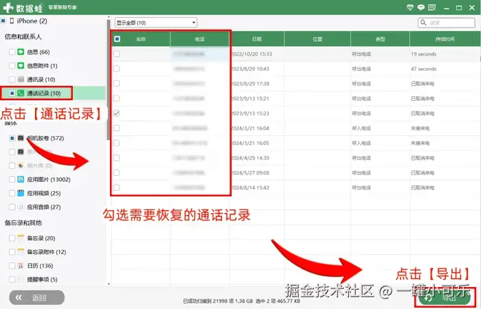 步骤3:在数据扫描结束之后,点击 【通话记录】 ,查看可恢复的通话记录,并勾选需要恢复的记录,最后点击 【导出】 即可。