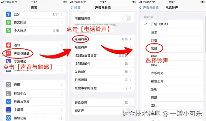 步骤2:选择并点击需要设置的铃声模式,如点击 【电话铃声】 ,下滑选择喜欢的铃声。