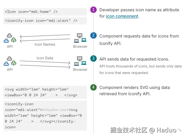 - SVG sprite在单项目维护使用体验良好,一次性插入SVG至HTML,可在多处通过svg-use重用。但是需要自己维护一个基础的SVG组件