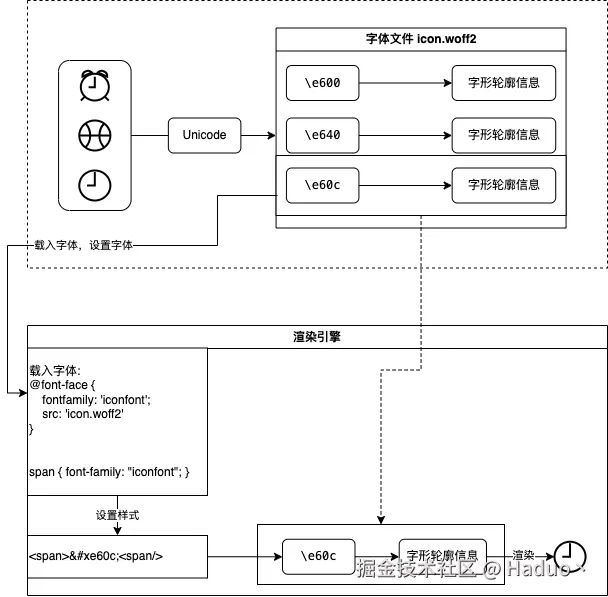 - 将图标转为字体文件,字体文件中含有unicode和图标轮廓信息的映射关系