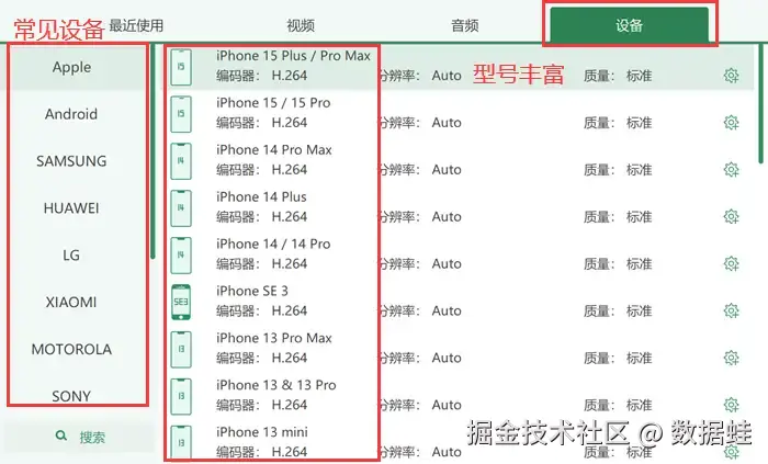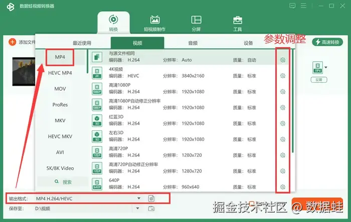 步骤二: 在 【输出格式】 中选择mp4,自行调整选择格式参数。若已经确认播放设备,可在 【设备】 页,直接匹配播放器,免除后续转码的烦恼。