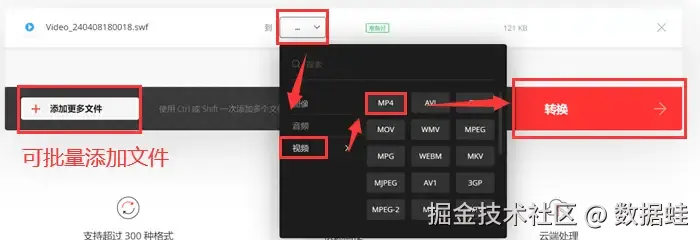 步骤二: 在转换格式设置的下拉菜单中选择mp4格式作为输出格式,点击转换按钮。如果需要转换的swf文件较多,还可以点击 【添加更多文件】 ,批量转换。
