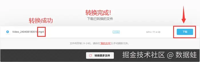 步骤三: 点击红色的 【转换】 按钮,等待转换完成。转换完成后,点击 【下载】 按钮,保存转换后的mp4文件到你的电脑。