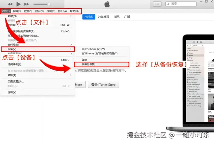 步骤2:依次点击iTunes界面的 【文件】-【设备】-【从备份恢复】 选项,即可恢复。