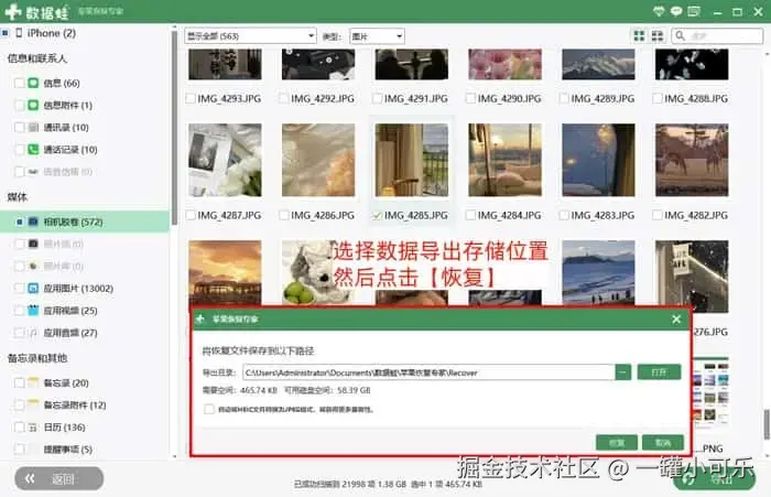 步骤3:点击 【导出】 后,界面会提示你选择数据的存储位置,选择完毕后,点击 【恢复】 即可。