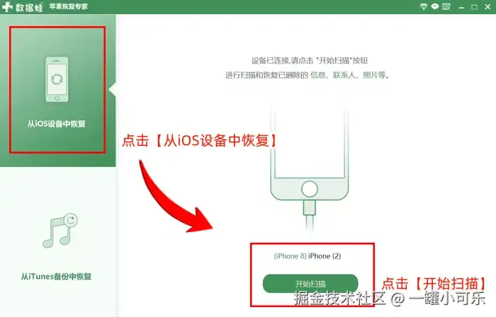 步骤1:用苹果USB数据线将手机和电脑连接起来,点击 【从iOS设备中恢复】-【开始扫描】 。
