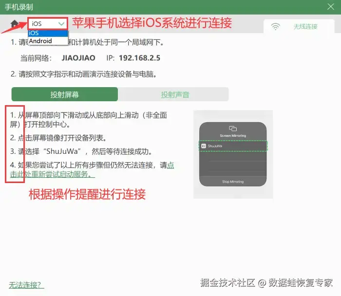 下面是使用数据 蛙录屏软件对苹果手机进行录屏录音的操作步骤: