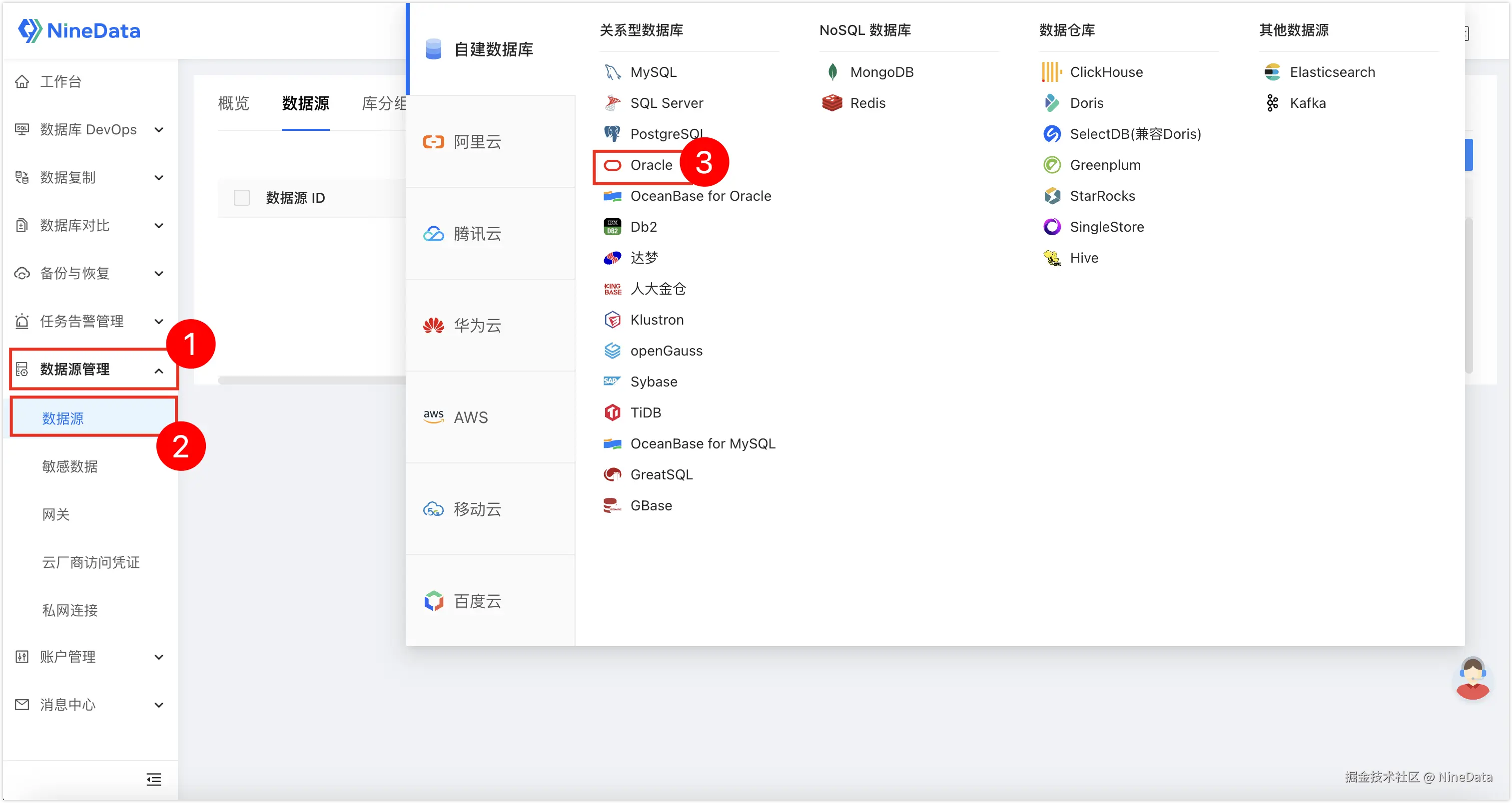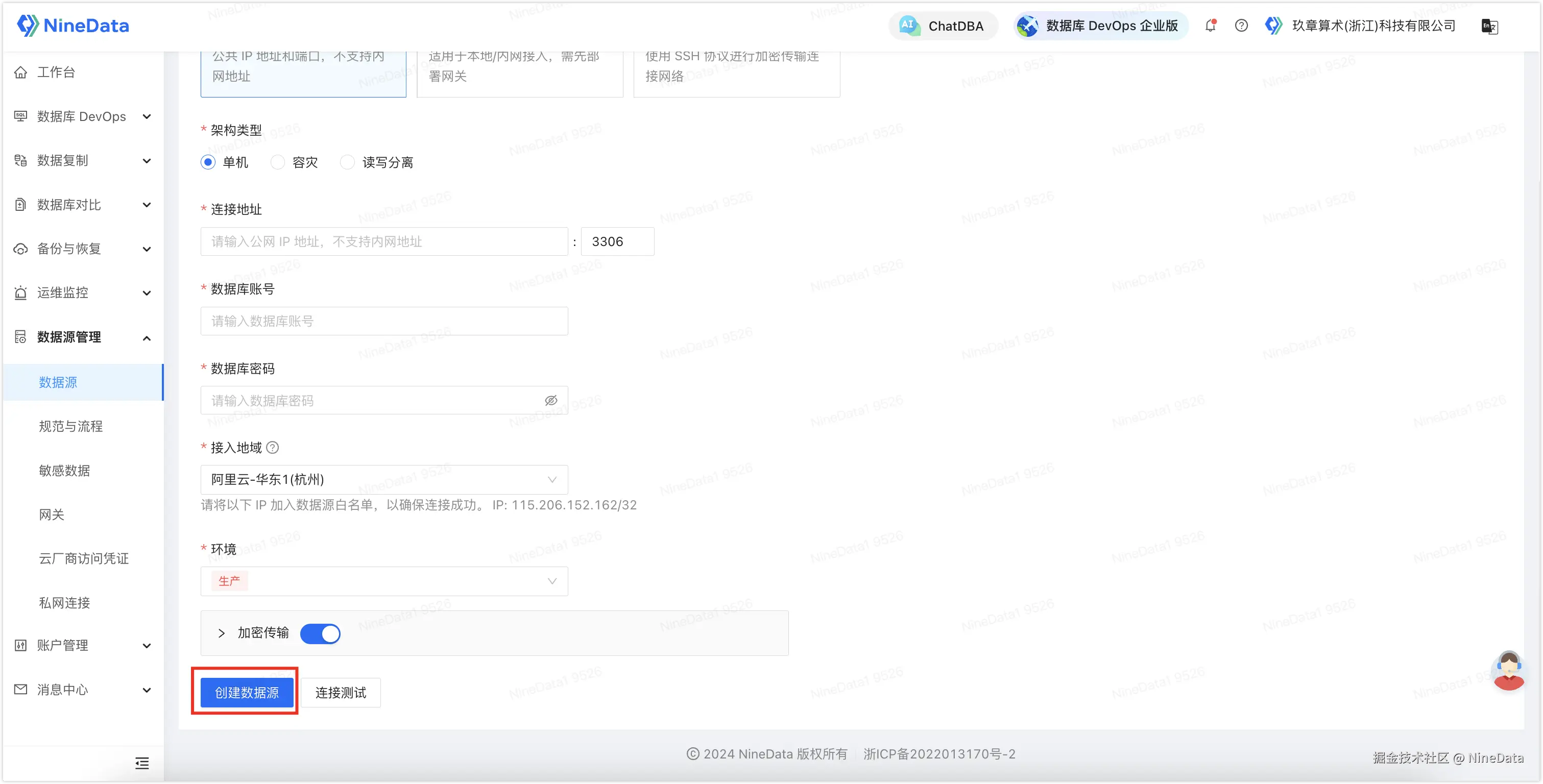 - 登录 NineData 控制台,单击数据源管理>数据源,然后在页面中单击创建数据源,选择需要录入的数据源。