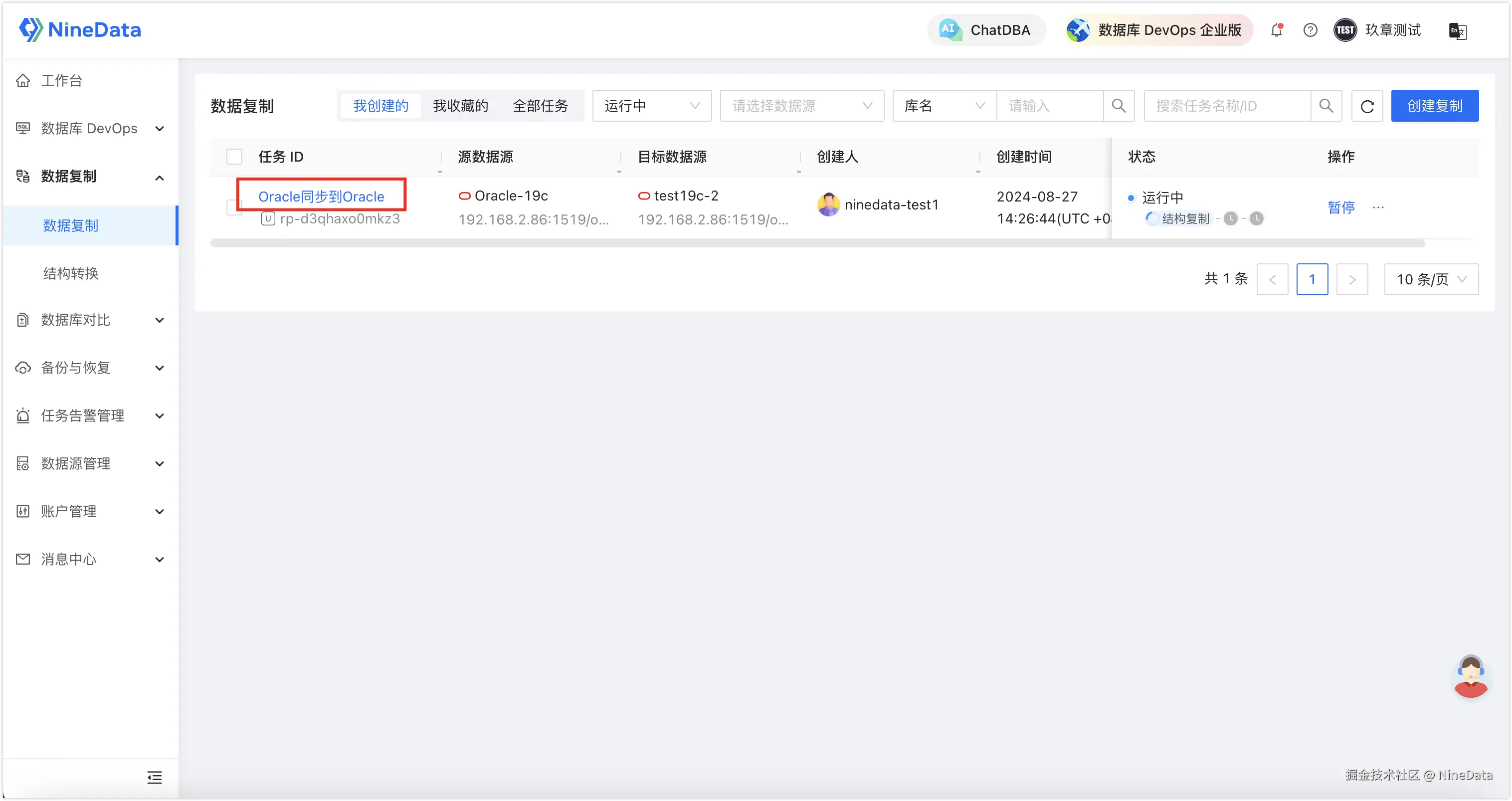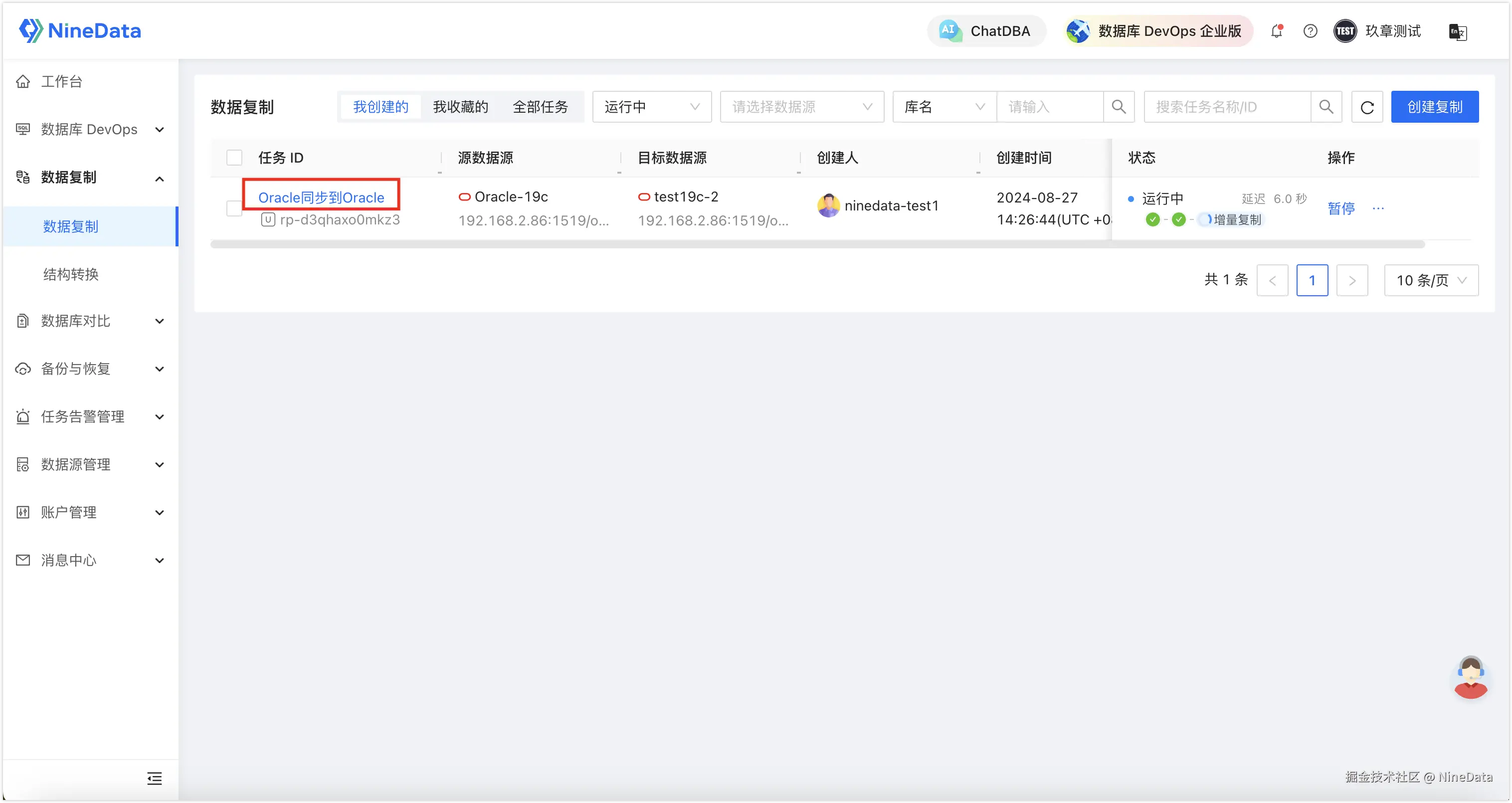 - 登录 NineData 控制台,单击数据复制>数据复制,然后单击步骤二中创建的复制任务。