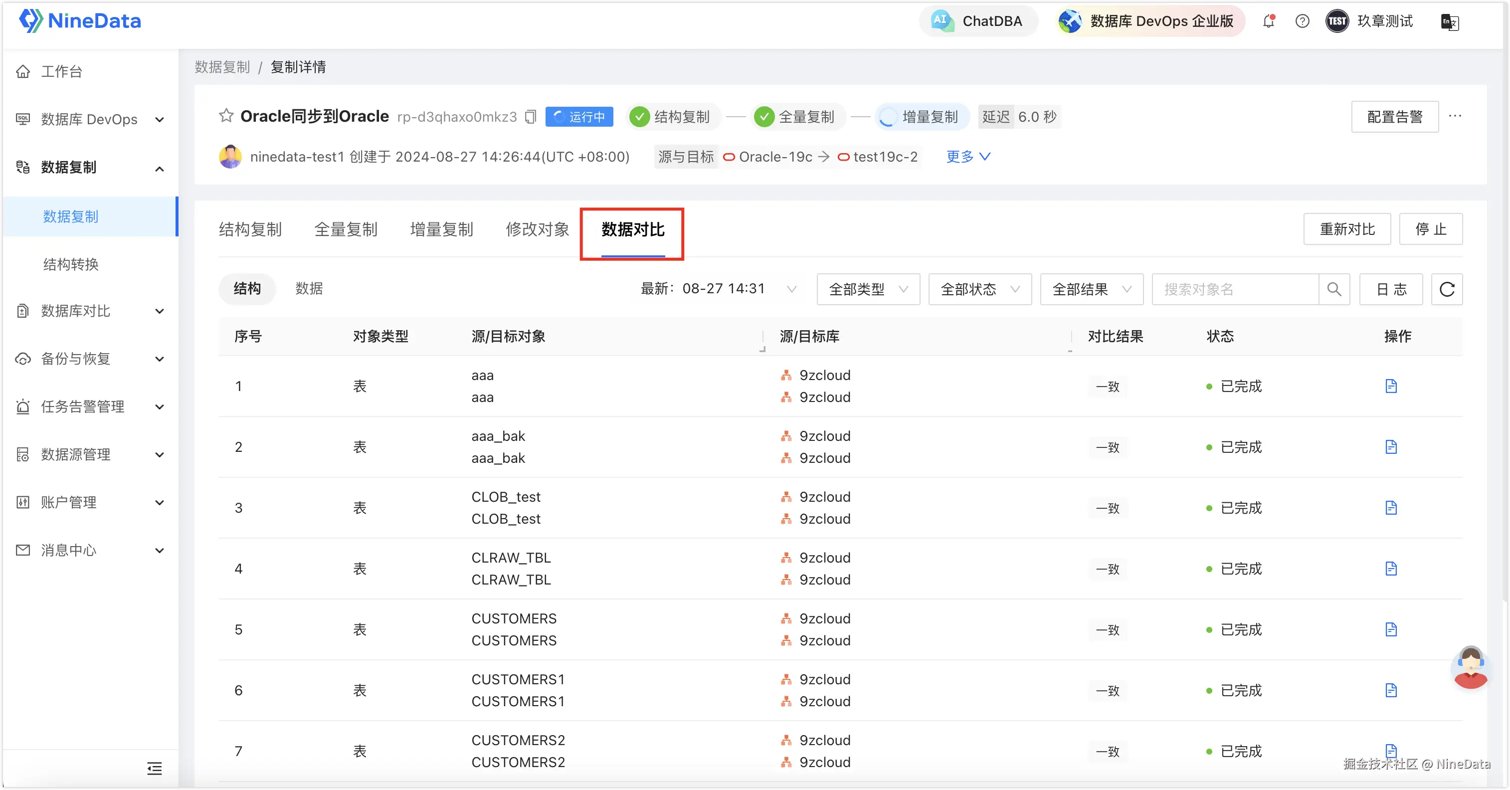除了同步功能以外,NineData 还提供了同步后源端和目标端同步数据的对比功能,以确保目标端数据的完整性。