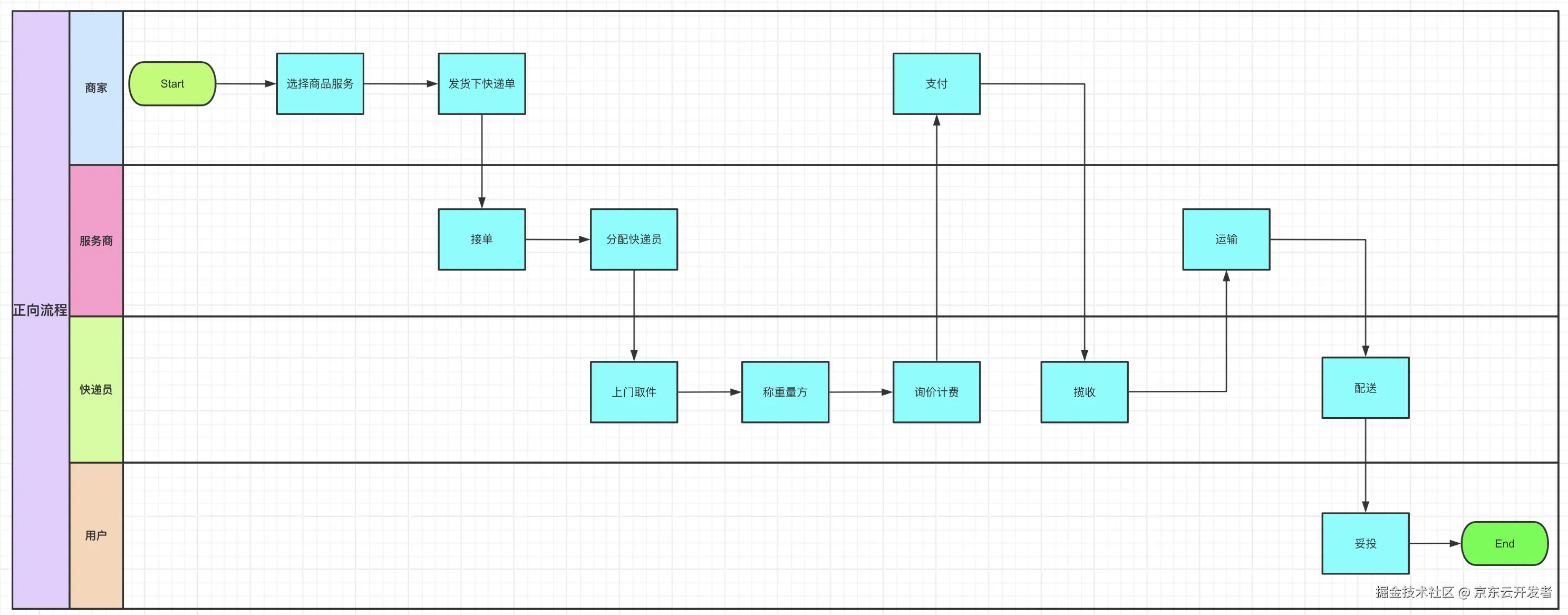 正向流程: 从B端商家视角来看,商家选择服务商品比如卓配产品后,进行下单,服务商进行接单,分配快递员,快递员上门取件,对用户邮寄的货品进行称重量方,询价计费,然后商家支付运费,快递员完成揽收,进入履约层面:货品进行运输,配送,直至C端用户签收完成妥投。