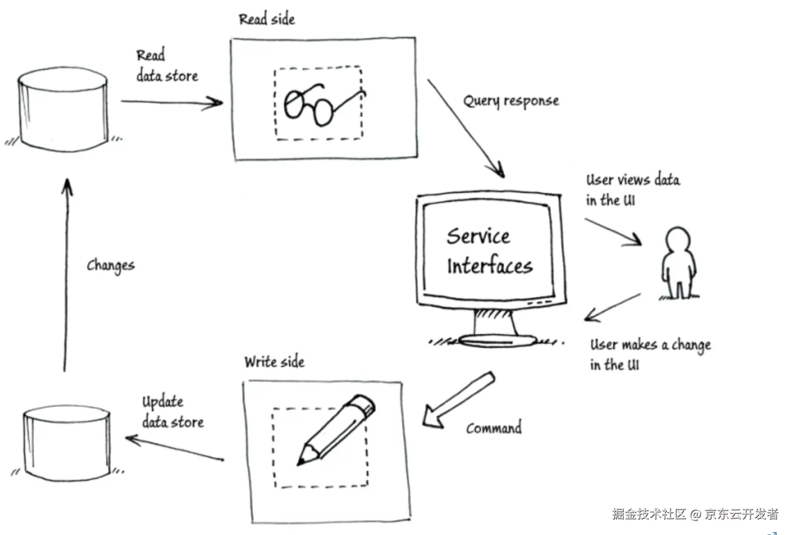 应用层面,领域驱动设计(DDD)中最著名的CQRS(Command Query Responsibility Segregation)将写服务和读服务进行隔离。写服务主要处理来自客户端的command写命令,而读服务处理来自客户端的query读请求,这样从应用层面进行读写隔离,不仅可以提高系统的可扩展性,同时也会提高系统的可维护性,应用层面我们都采用微服务架构,应用层都是无状态服务,可以扩容加机器随意扩展,存储层需要持久化,扩展就比较费劲。除了应用层面的CQRS,在存储层面,我们也会进行读写隔离,例如数据库都会采用一主多从的架构,读请求可以路由到从库从而分担主库的压力,提高系统的性能和吞吐量。所以应用层面通过读写隔离主要解决可扩展问题,存储层面主要解决性能和吞吐量的问题。