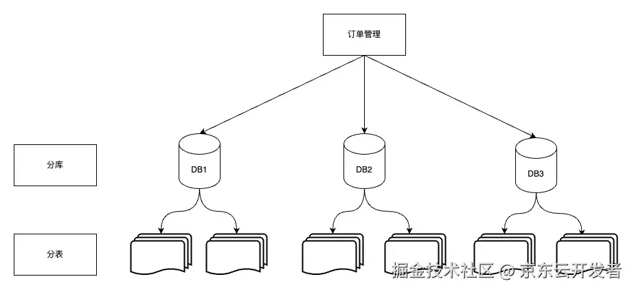 当我们在应用层进行水平扩展时,每增加一台机器都会增加数据库的访问链接,数据库的连接数属于宝贵资源,达到上限后,应用层再扩容就会出现连接数耗尽的异常,此时存储层成了整个系统高并发的瓶颈,针对数据库我们一般采用分片(分而治之)的思想:分库分表,通过增加库实例来增加访问的连接数,下图是订单进行分库分表的架构。