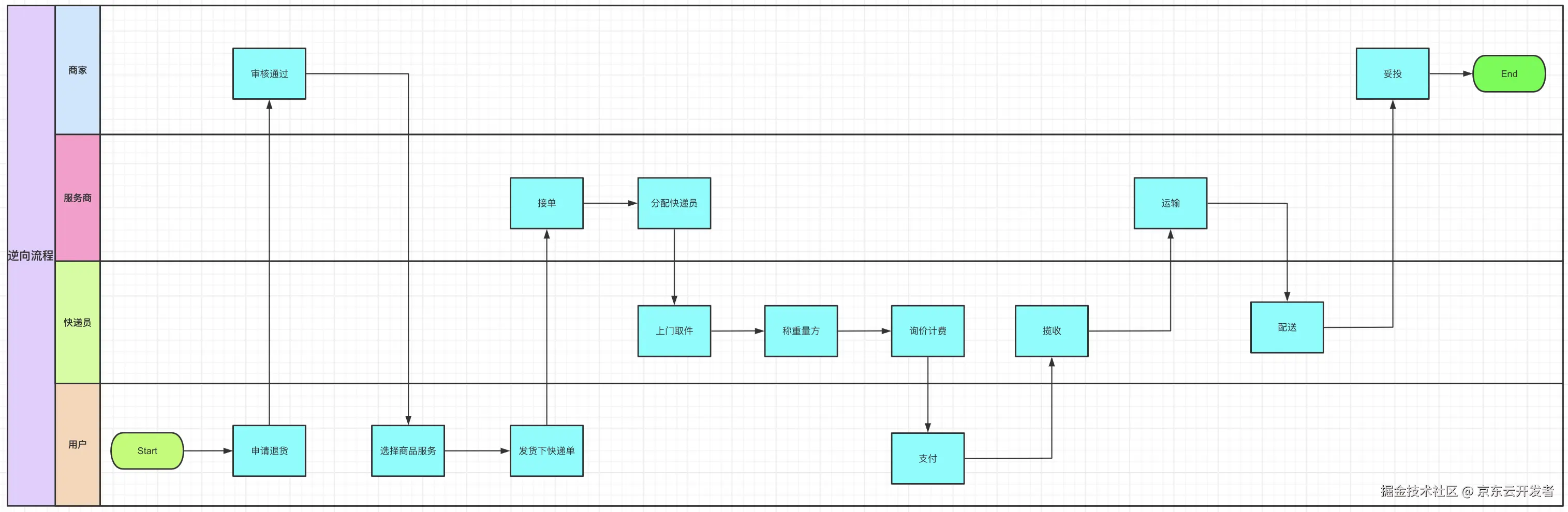 逆向流程: 从C端用户视角来看,用户需要申请售后退货,待商家审核通过后,选择相应的商品服务进行下单,后续的流程和正向流程类似。