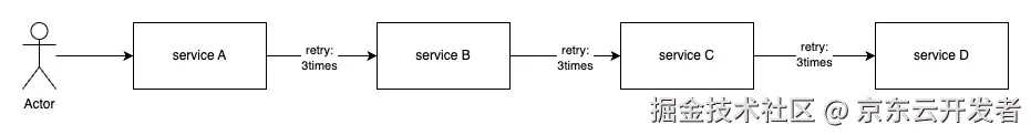 分布式系统中性能的影响主要是通信,无论是在分布式系统中还是垮团队沟通,communication是最昂贵的;比如我们研发都知道需求的交付有一半以上甚至更多的时间花在跨团队的沟通上,真正写代码的时间是很少的;分布式系统中我们查看调用链路,其实我们系统本身计算的耗时是很少的,主要来自于外部系统的网络交互,无论是下游的业务系统,还是中间件:Mysql, redis, es等等;所以在和外部系统的一次请求交互中,我们系统是希望尽最大努力得到想要的结果,但往往事与愿违,由于不可靠网络的原因,我们在和下游系统交互时,都会配置超时重试次数,希望在可接受的SLA范围内一次请求拿到结果,但重试不是无限的重试,我们一般都是配置重试次数的限制,偶尔抖动的重试可以提高我们系统的可用率,如果下游服务故障挂掉,重试反而会增加下游系统的负载,从而增加故障的严重程度。在一次请求调用中,我们要知道对外提供的API,后面是有多少个service在提供服务,如果调用链路比较长,服务之间rpc交互都设置了重试次数,这个时候我们需要警惕重试风暴。如下图service D 出现问题,重试风暴会加重service D的故障严重程度。对于API的重试,我们还要区分该接口是读接口还是写接口,如果是读接口重试一般没什么影响,写接口重试一定要做好接口的幂等性。