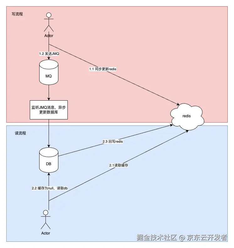 针对写多读少的系统,我们一般采用同步更新缓存,异步更新数据库,通过缓存来进行抗写的流量,异步化更新数据库,通过缓存和异步化提高系统的性能;此种技术方案以缓存数据为主,数据库数据为辅,这是我了解到的京东物流这边大部分团队的技术方案,例如我们物流平台-统一平台小组的订运关系单据的存储采用的就是这种技术方案