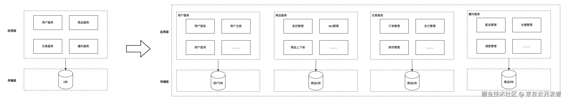 整个软件应用的架构经历单体应用,SOA, 微服务,服务网格的演进。早期的架构风格所有的服务功能都融合在单体应用中,通过单体服务来抗所有的流量,后来随着业务的复杂性和用户的增多以及我们基于对业务的深入理解采用DDD(领域驱动设计)来指导我们按照领域划分服务,进行微服务建设,下图是一个电商的单体应用到按照DDD进行微服务划分的一个演进过程。