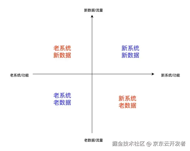 根据新老系统和新老数据我们可以将系统划分为四个象限:第一象限:新系统和新数据是我们系统改造上线后的状态,第三象限:老系统和老数据是我们系统改造上线前的状态,第一象限和第三象限的问题我们在研发和测试阶段一般都能发现排除掉,线上故障的高发期往往出现在第二和第四象限,第二象限是因为没有做好向前兼容性,例如上线过程中,发现问题进行了代码回滚,但是在上线过程中产生了新数据,回滚后的老系统不能处理上线过程中新产生的数据,导致线上故障。第四象限是因为没有做好向后兼容性,上线后新系统影响了老流程。针对第二象限的问题,我们可以构造新的数据去验证老的系统,针对第四象限的问题,我们可以通过流量的录制回放解决,录制线上的老流量,对新功能进行验证。