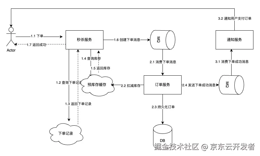 针对于这种流量洪峰下的秒杀场景,对于接单接口的性能是很大的考验,所以接单接口不会有很多同步交互的复杂逻辑。我们一般都是先异步将订单接下来,返回给用户成功,通过消息队列来削峰处理订单,缓存存储相关sku的库存,当扣减库存成功后,再短信通知用户支付订单。