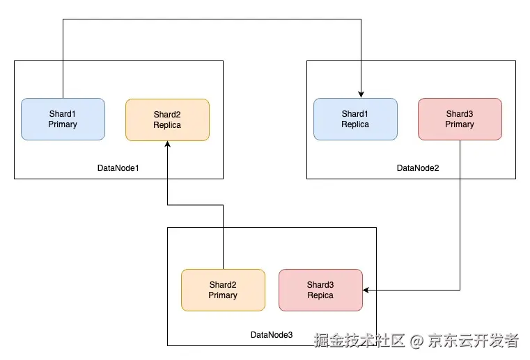 我们在创建ES索引时,会指定分片的数量和副本的数量,分片的数量确定后是不允许修改的,副本的数量允许修改,分片的数量一般和数据节点的数量保持一致,这样能将索引的数据分配到每个数据节点上,每个数据节点都存储索引的部分数据,Primary分片可以对外提供读写服务,Replica分片对外提供读服务的同时作为备份节点保证可用性,ES索引的不同分片在不同数据节点的分布如下图所示。