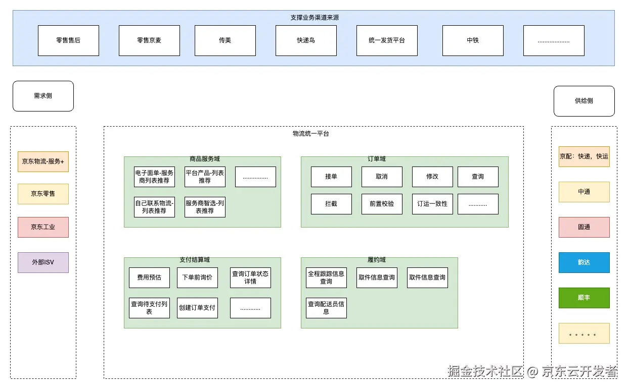 应用领域的划分主要根据我们的业务流程介绍提供了那些功能;目前我们系统支撑的业务来源包括:零售的商家后台(京麦),订单中台,售后,传美,快递鸟,中铁,统一发货平台等等;