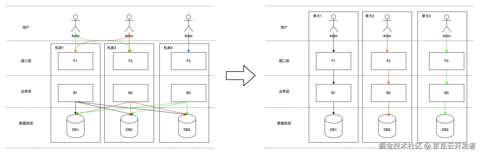 集群中数据库的主从库数量是有限制的的,达到最大限制后,一个机房的数据库集群成了系统的瓶颈,解决方案是进行单元化建设,系统的流量和数据闭环在一个单元,这个单元分布在全国甚至全世界不同的地域,而不是集中在某个机房某个地域,北京的系统单元为北京用户提供服务,上海的系统单元为上海用户提供服务,就类似于京东物流的仓库一样,建在离用户最近的地方,北京仓服务北京用户,上海仓服务上海用户。大家可以看到系统的建设和业务的发展底层的思想都是统一的,中国的头部互联网还都是业务驱动,所以技术要服务好业务。总之我们可以看到通过分库分表和单元化这种垂直扩展提高并发的同时也增强了系统的可用性,下图是我们进行单元化建设的过程。