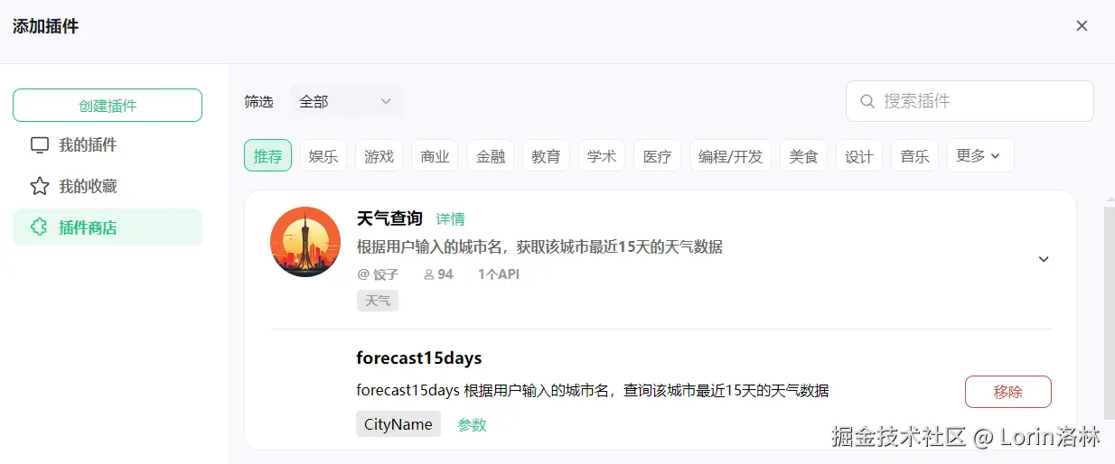 - 点击技能中的插件,添加天气查询插件,并适当修改提示语。