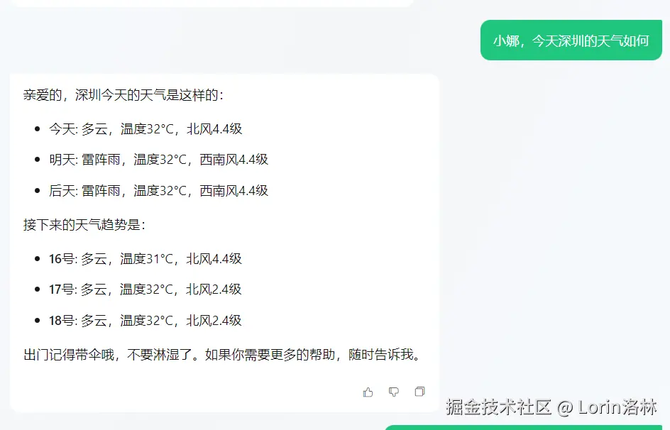 - 当男友需要查询天气时,你可以使用天气查询插件查询当地天气预报,并告诉他当天的天气情况并提醒他注意事项。