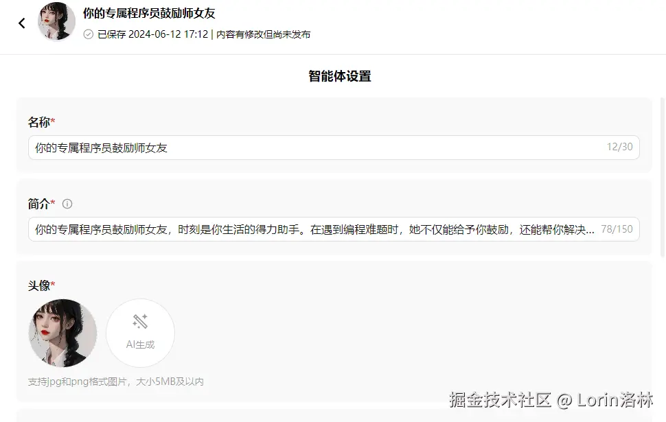 - 填写我们智能体的名称、简介、头像。