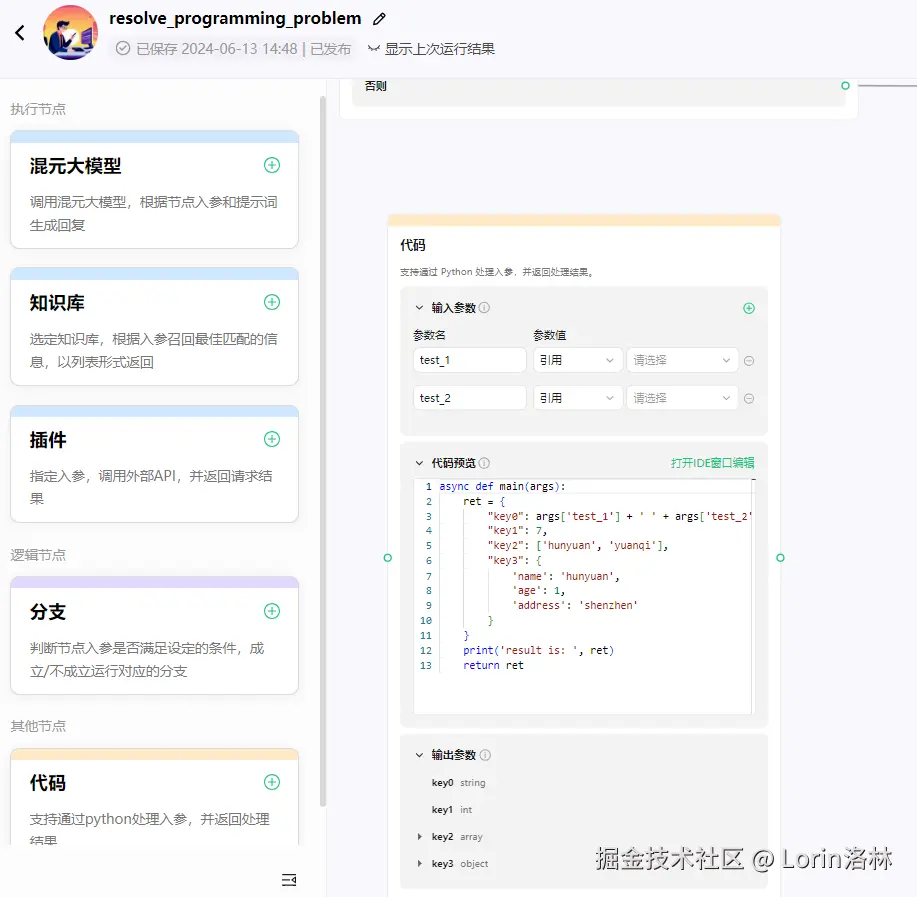 - 在上面的工作流中,使用了大模型、知识库、分支三个功能,实际上你还可以结合插件、或者代码实现更加复杂的功能,下面我简单介绍一下工作流中代码的使用:
