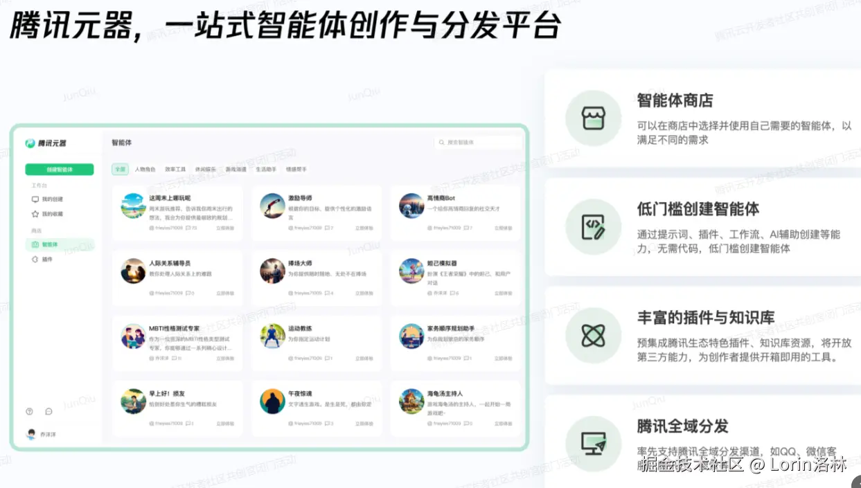 - 腾讯元器是基于混元大模型开发的一站式智能体创作与分发平台。无需代码,您可快捷创建AI智能体/插件/知识库,还能将智能体一键分发到QQ、微信客服、腾讯云等渠道,充分体验到AI技术带来的便利与革新。