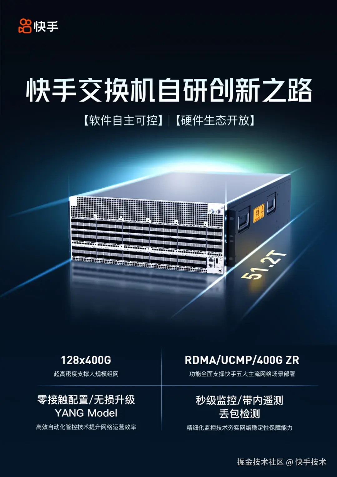 导读:快手自研交换机是2021年初开始立项,坚持软件自主可控 / 硬件生态开放的整体战略,历经三年磨砺,发布扛鼎之作『快手自研51.2T交换机』,是首家引入多元化交换芯片并在数据中心网络中规模化部署!更是首家采用国产化交换芯片并规模部署落地!