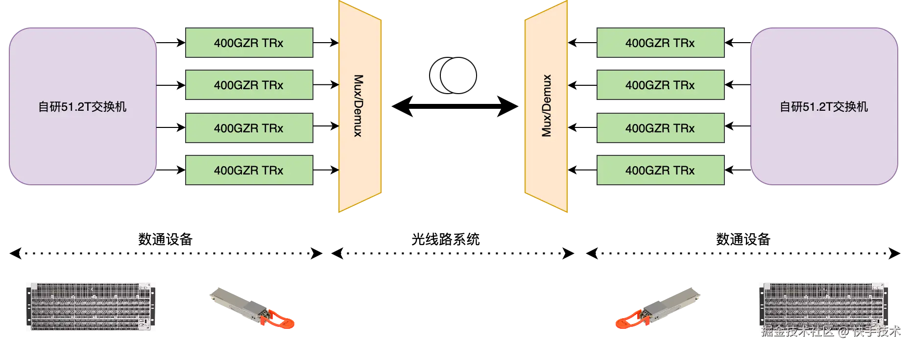 自研51.2T交换机在快手跨数据中心网络互联中的创新应用,通过支持400G ZR彩光模块,该交换机能够直接与对端光层传输设备相连,实现IPoDWDM(IP over Dense Wavelength Division Multiplexing)技术方案。这一创新不仅省去了传统传输系统中的电层设备和客户侧灰光模块,简化了网络结构,更在提升数据传输效率的同时,实现了网络建设成本的显著降低。