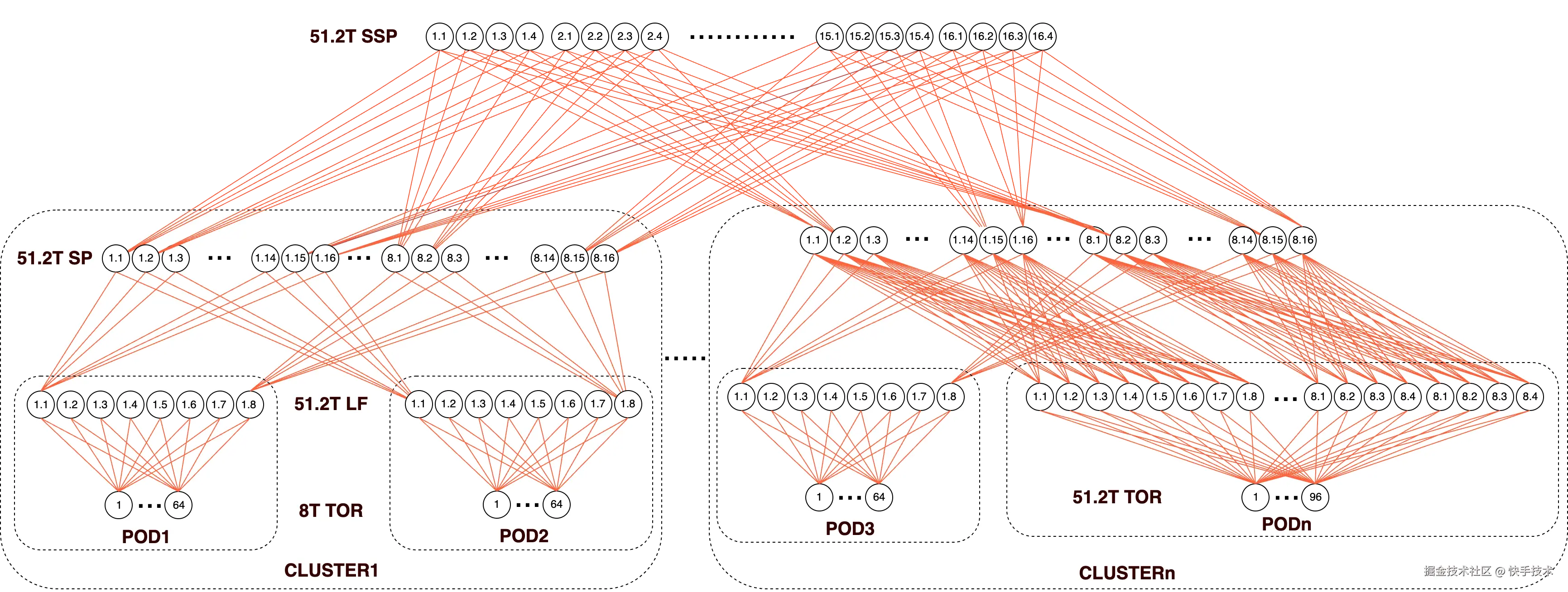 基于自研 51.2T 交换机,快手构建了 全新一代数据中心网络架构,单个网络集群即可轻松驾驭30万台100G服务器的接入需求,其容量之巨,较上一代产品实现了质的飞跃,同时前瞻性地兼容了未来200G/400G服务器的接入,在成本与性能和方面具备显著优势,确保了技术投资的长期价值。