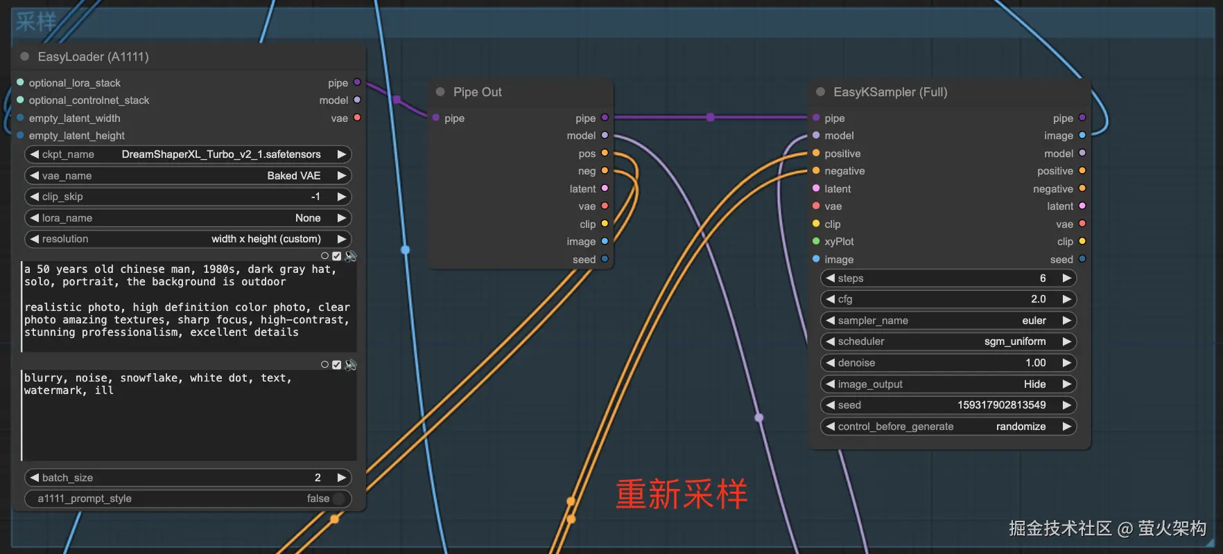 然后就是采样部分的节点,这些节点中有两点比较重要,一是使用的基础模型,测试发现DreamShaperXL这个模型的修复效果比较真实;另外这种修复方式需要填写提示词,根据画面内容填写即可(注意这里需要是英文),本质上还是文生图的方式。